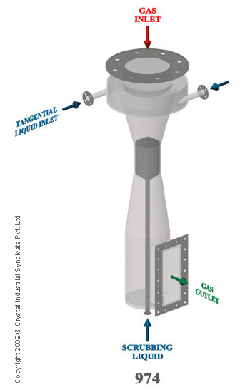 The Type 974 Scrubber is an annular fixed throat venturi in which the throat is formed by the annular area between the outer body and a center body (plug). Scrubbing liquid is introduced at the center body as well as at the top of the converging section.