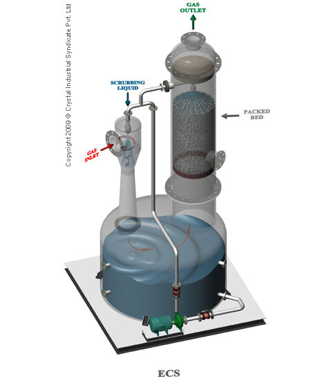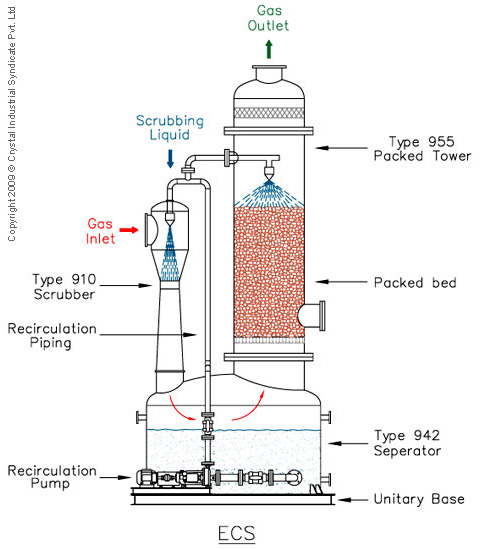 The ECS is a standard ejector–venturi, packed tower system which has been widely applied throughout industry for the absorption of various gases including chlorine. Fans are not required as the highly reliable ejector-venturi scrubber entrains the contaminated gas and causes air movement through the system. The first stage venturi is well suited to handle the high initial concentration of chlorine gas. After the gas exits the venturi the caustic is disengaged and contained within the separator. The gas then passes through the packed tower where the chlorine concentration is reduced to a level below, that required by the prevailing fire codes. A recirculation pump supplies the required caustic solution to the ejector-venturi scrubber and the packed lower.